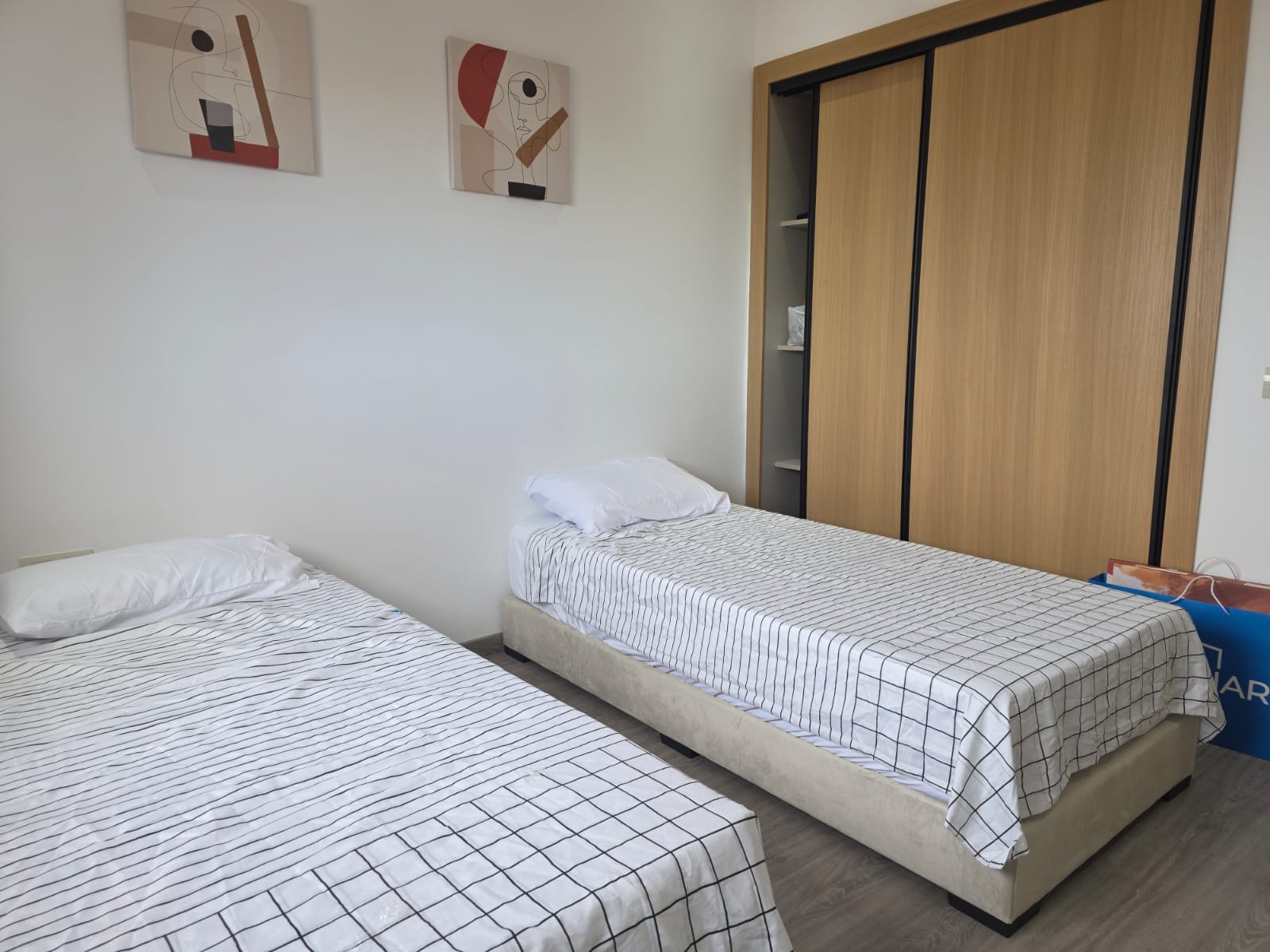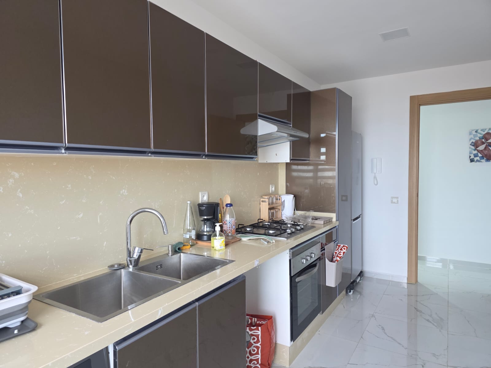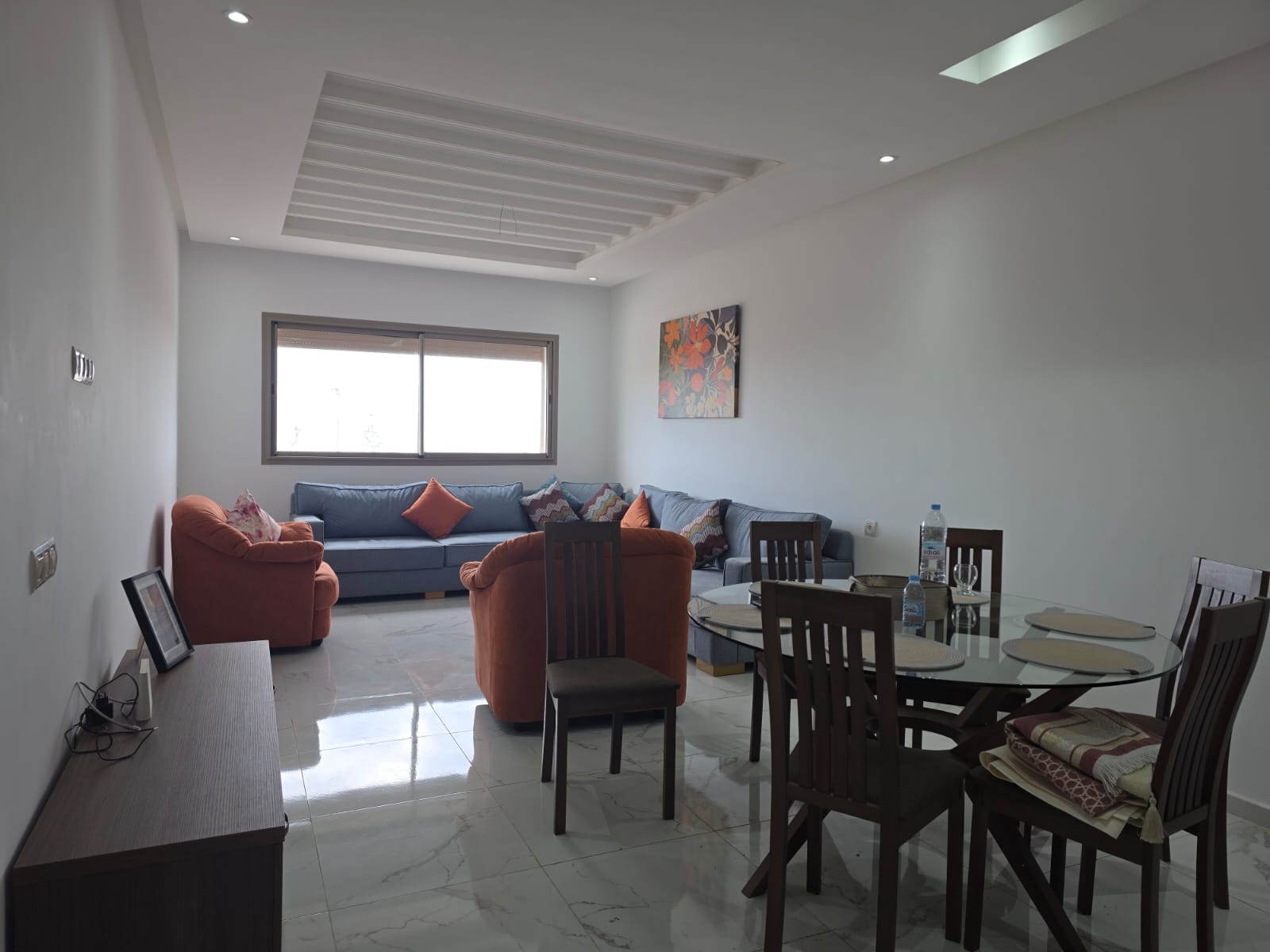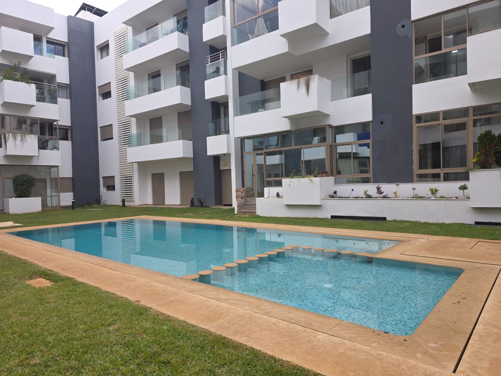 Témara, sable d’or un appartement meublé à louer au 1 er étage d’une superficie de 107 m² se composant d’un salon, 3 chambres à coucher, 2 salles de bain, une cuisine équipée, lave main invitées, une piscine, un ascenseur et place au garage.