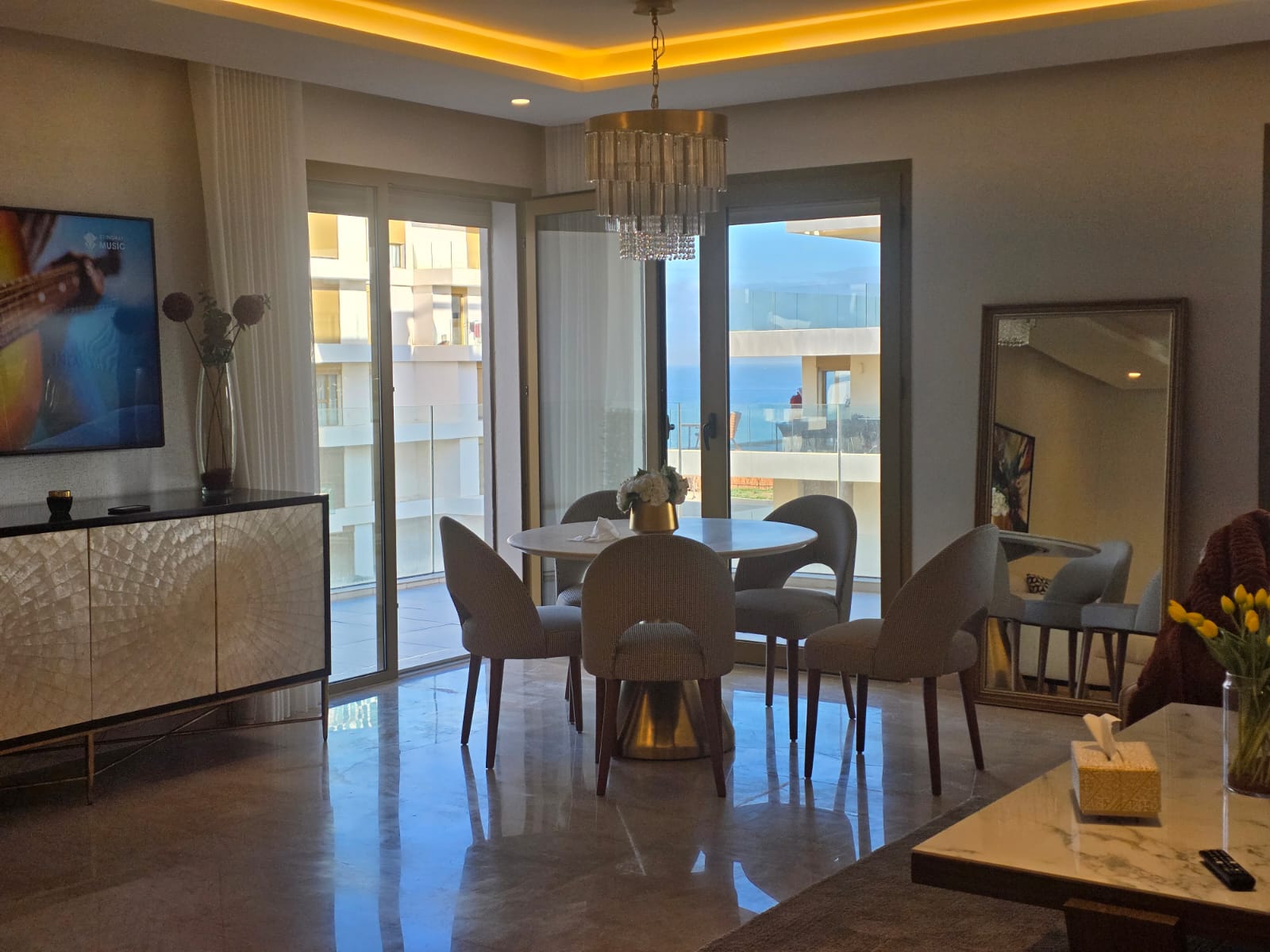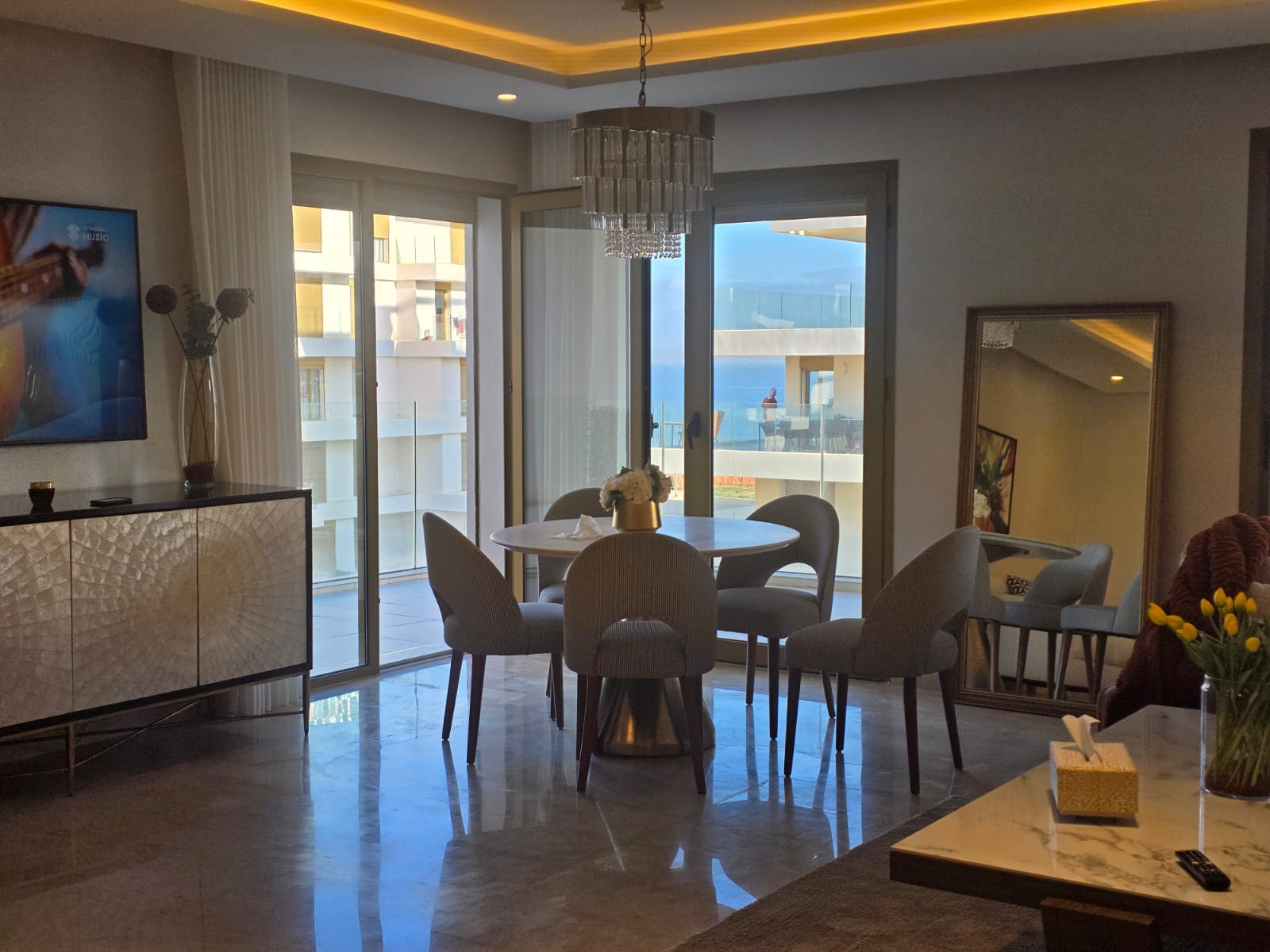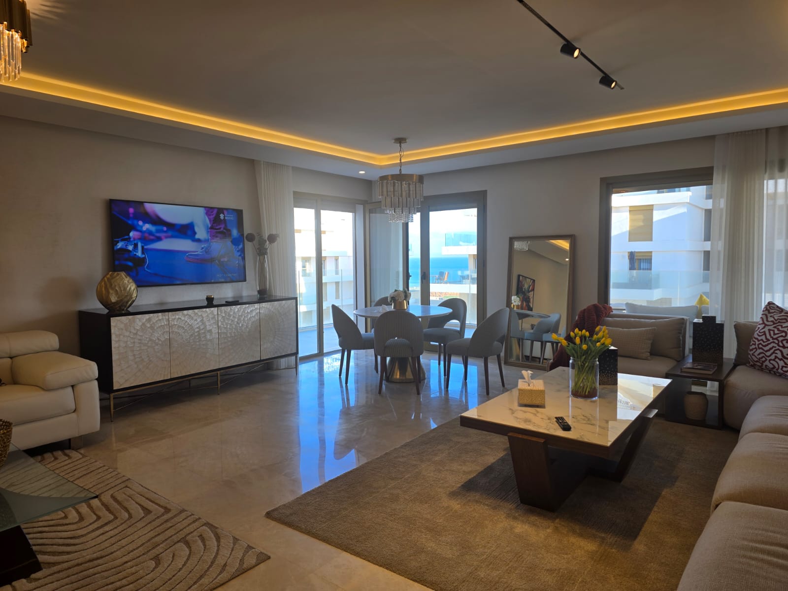un appartement meublé de standing à louer vue sur mer situé dans la prestigieuse résidence Carrousel, d’une superficie de 195 m² se composant d’un double salon moderne décor raffiné avec une salle à manger avec accès direct au balcon, 3 chambres à coucher avec des placards, 2 salles de bain, Cuisine équipée et aménagée avec électroménagers de qualité, climatisation centralisée, une piscine, 2 ascenseurs, et 2 places au parking.
