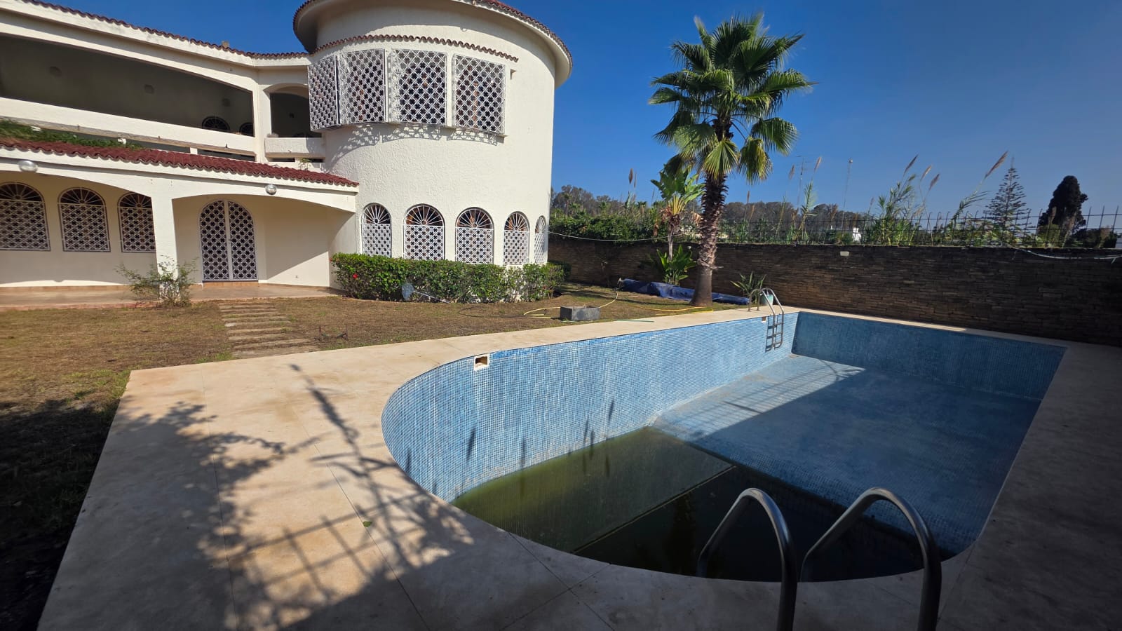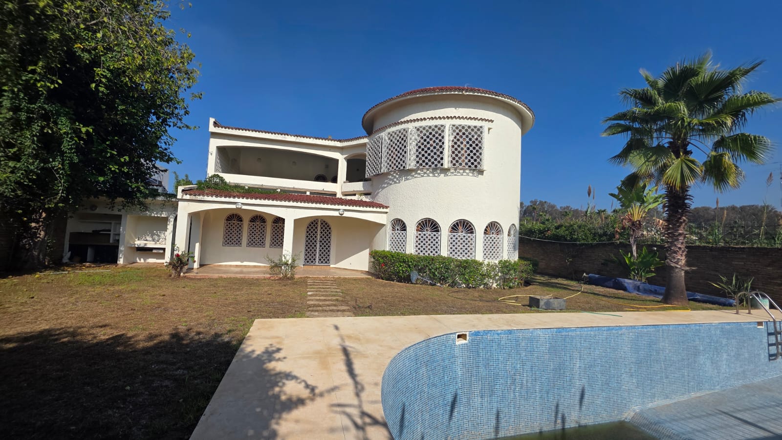 la pinède une villa à louer sur une superficie de 1000 m² de terrain et 500 m², sur deux niveaux se composant d’un salon ouvert avec un coin cheminée, 5 chambres à coucher, 2 salles de bain, une cuisine, une piscine, climatisation centralisée, un jardin.