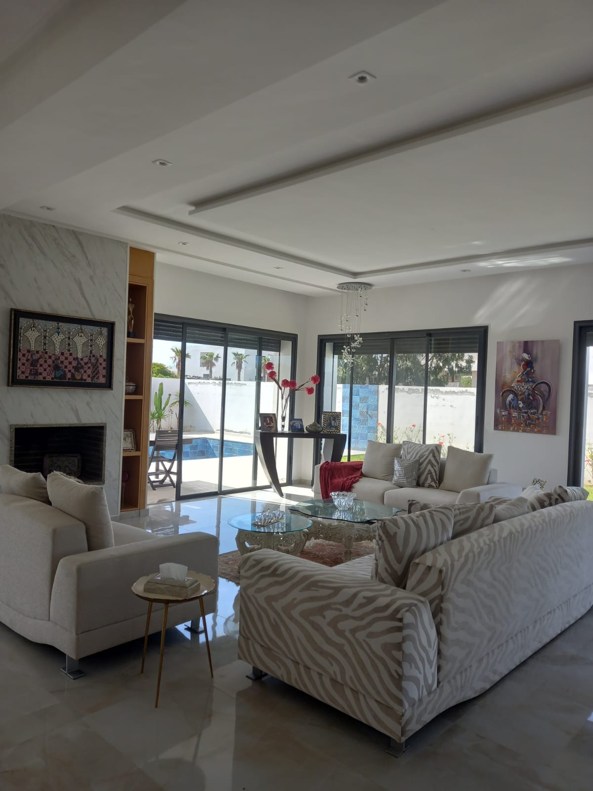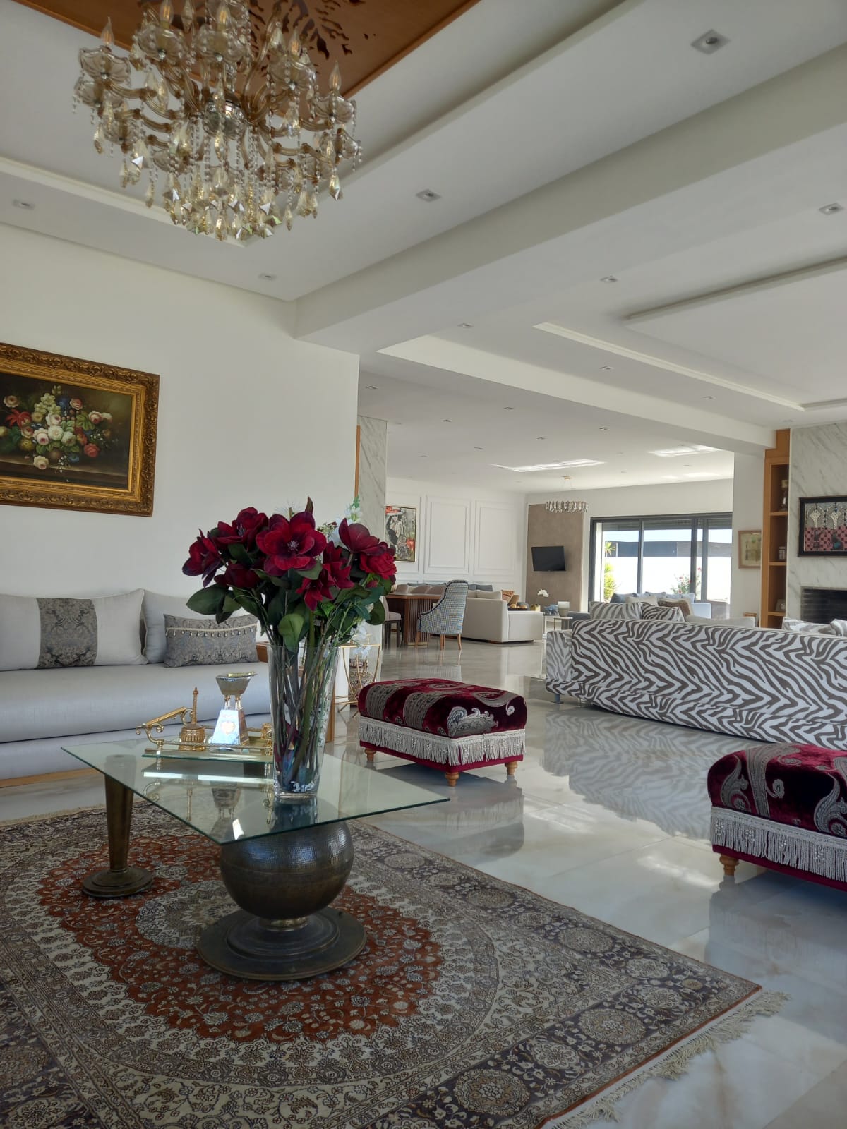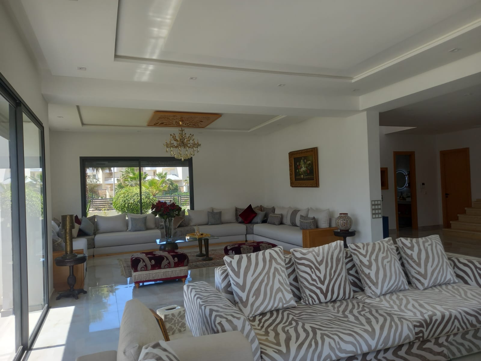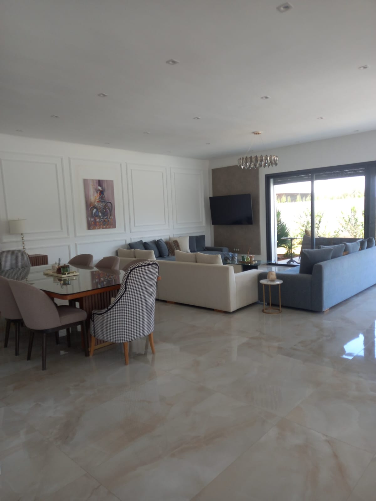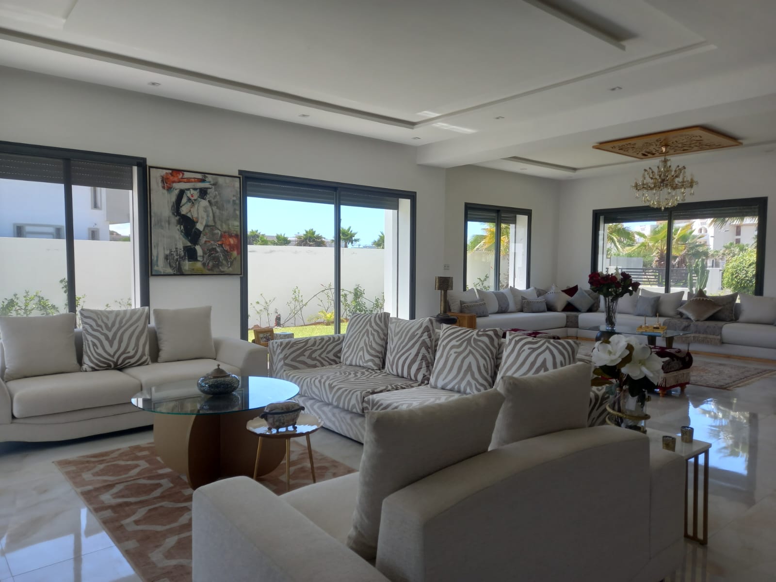 Bouznika golf Bahia Beach , une villa à vendre sur deux niveaux d’une superficie de 800 m² de terrain, et 600 m² construite se composant d’une réception ouverte, 4 salons , 4 chambres à coucher, 4 salles de bain, une cuisine équipée, une piscine, un jardin, ascenseur, une chambre de bonne et un garage pour 4 voitures