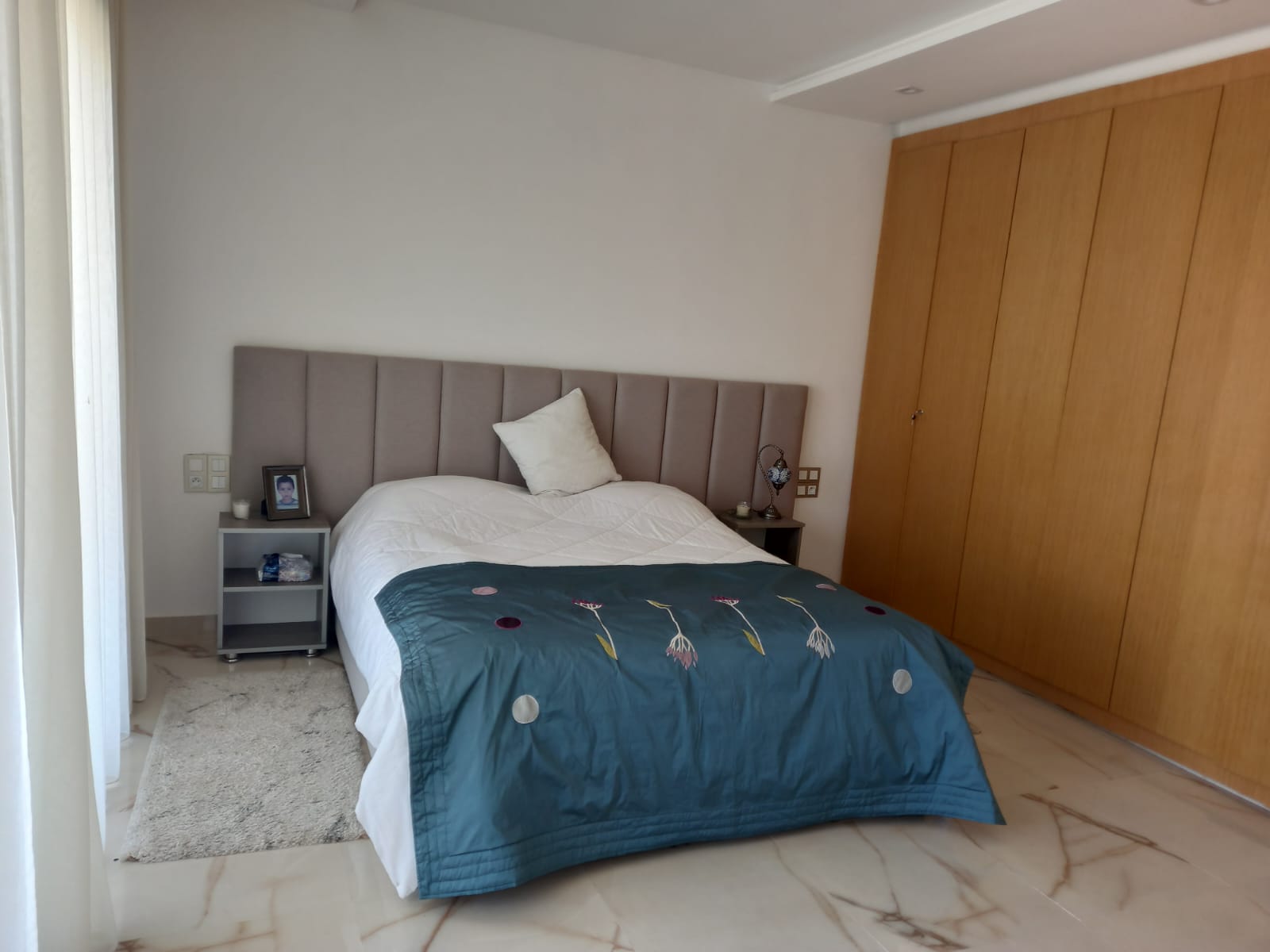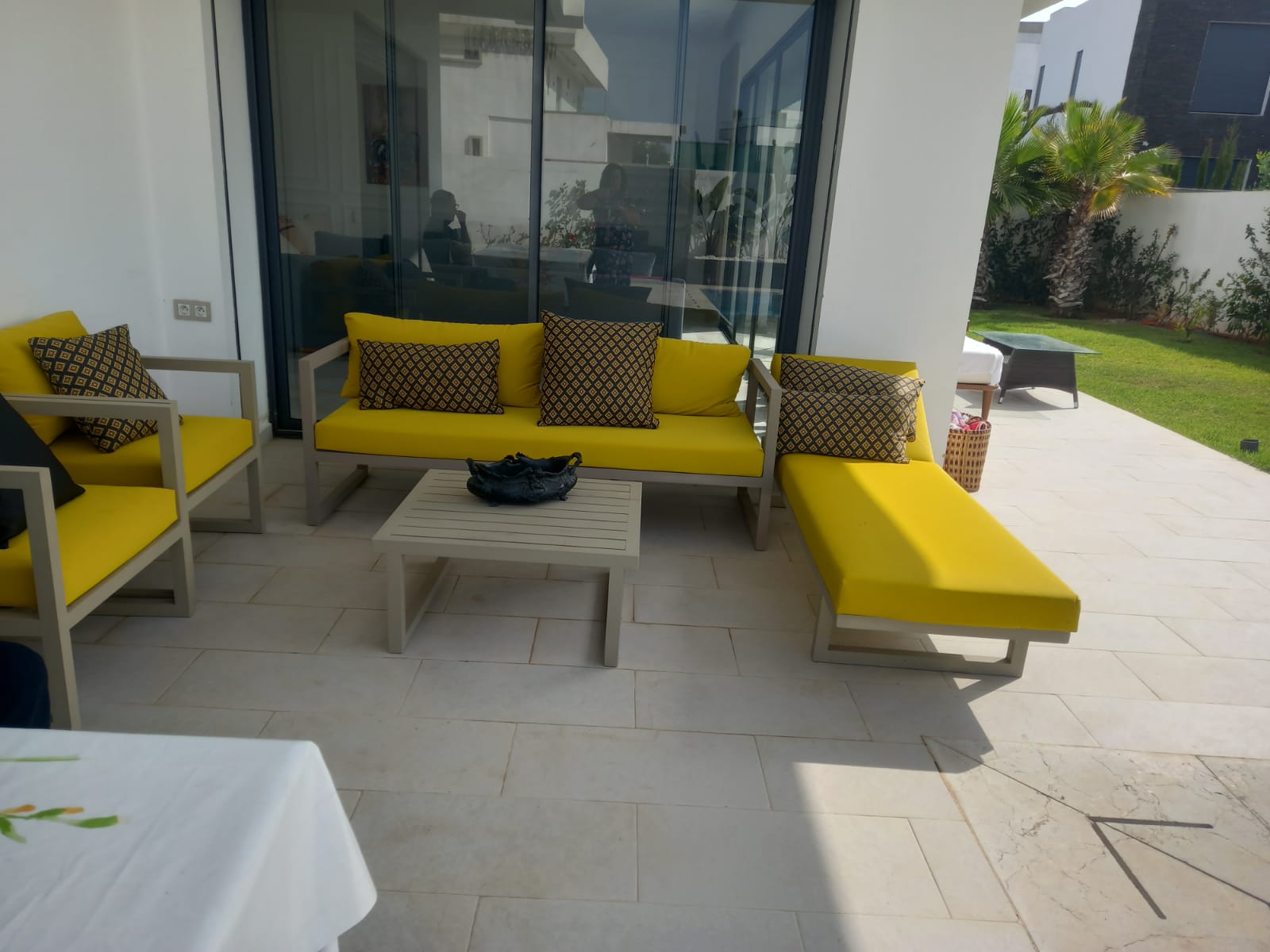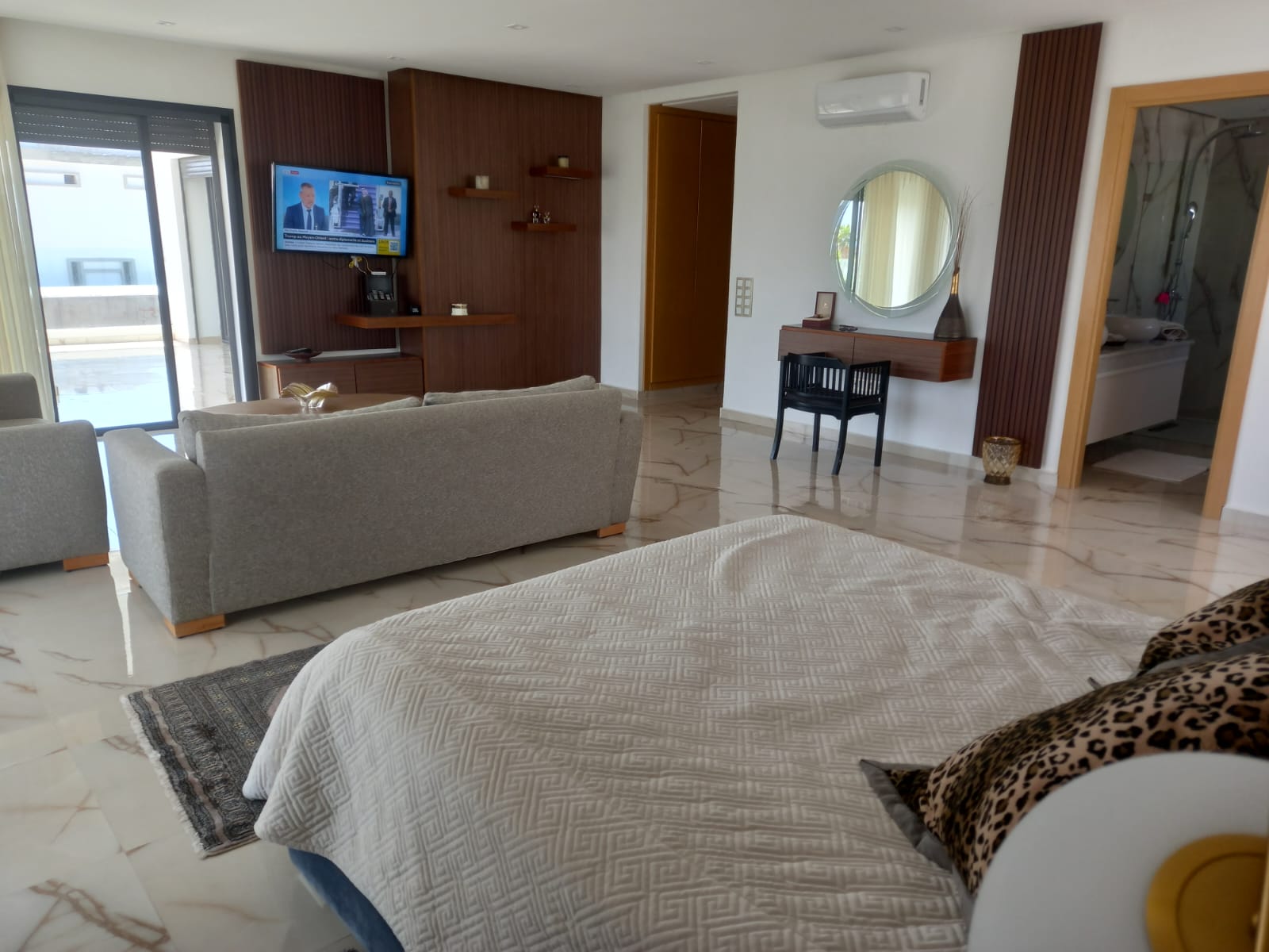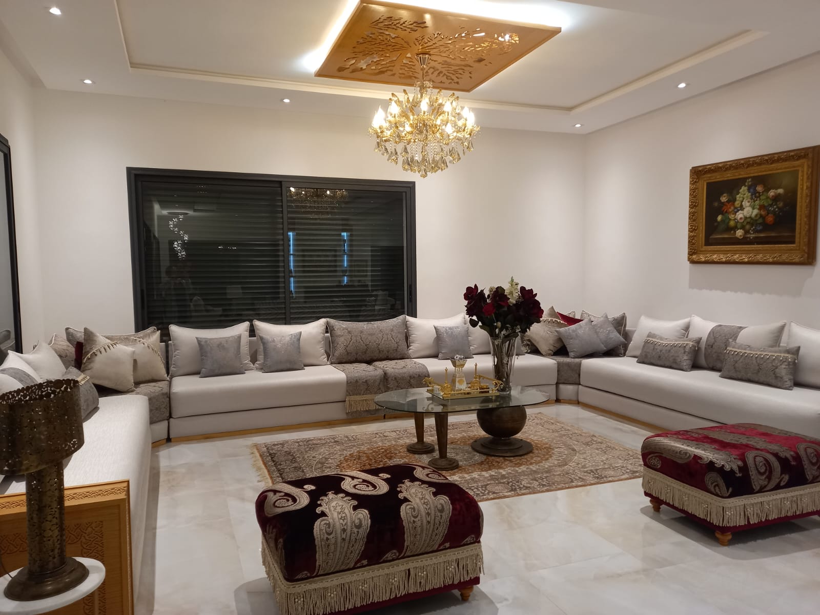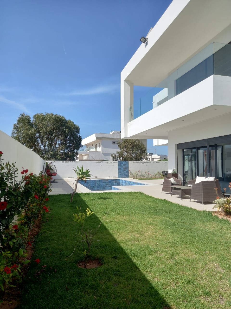 Bouznika golf Bahia Beach , une villa à vendre sur deux niveaux d’une superficie de 800 m² de terrain, et 600 m² construite se composant d’une réception ouverte, 4 salons , 4 chambres à coucher, 4 salles de bain, une cuisine équipée, une piscine, un jardin, ascenseur, une chambre de bonne et un garage pour 4 voitures