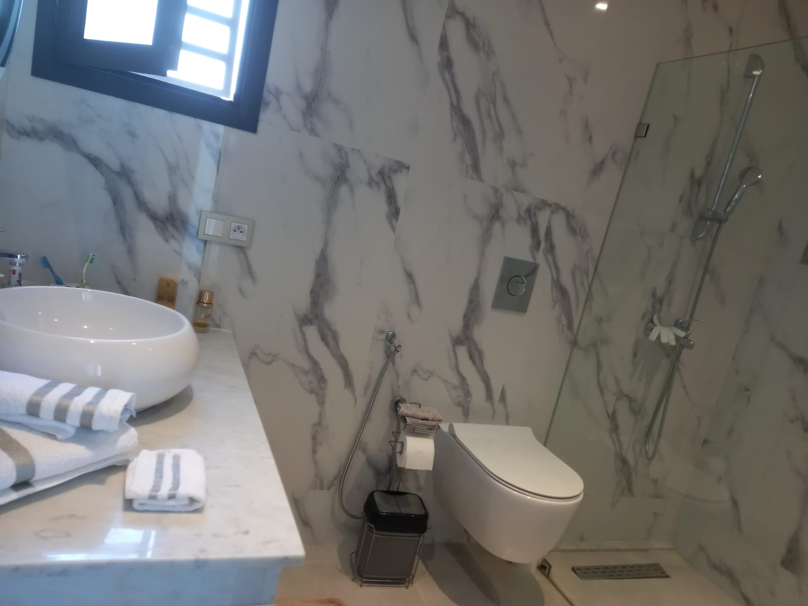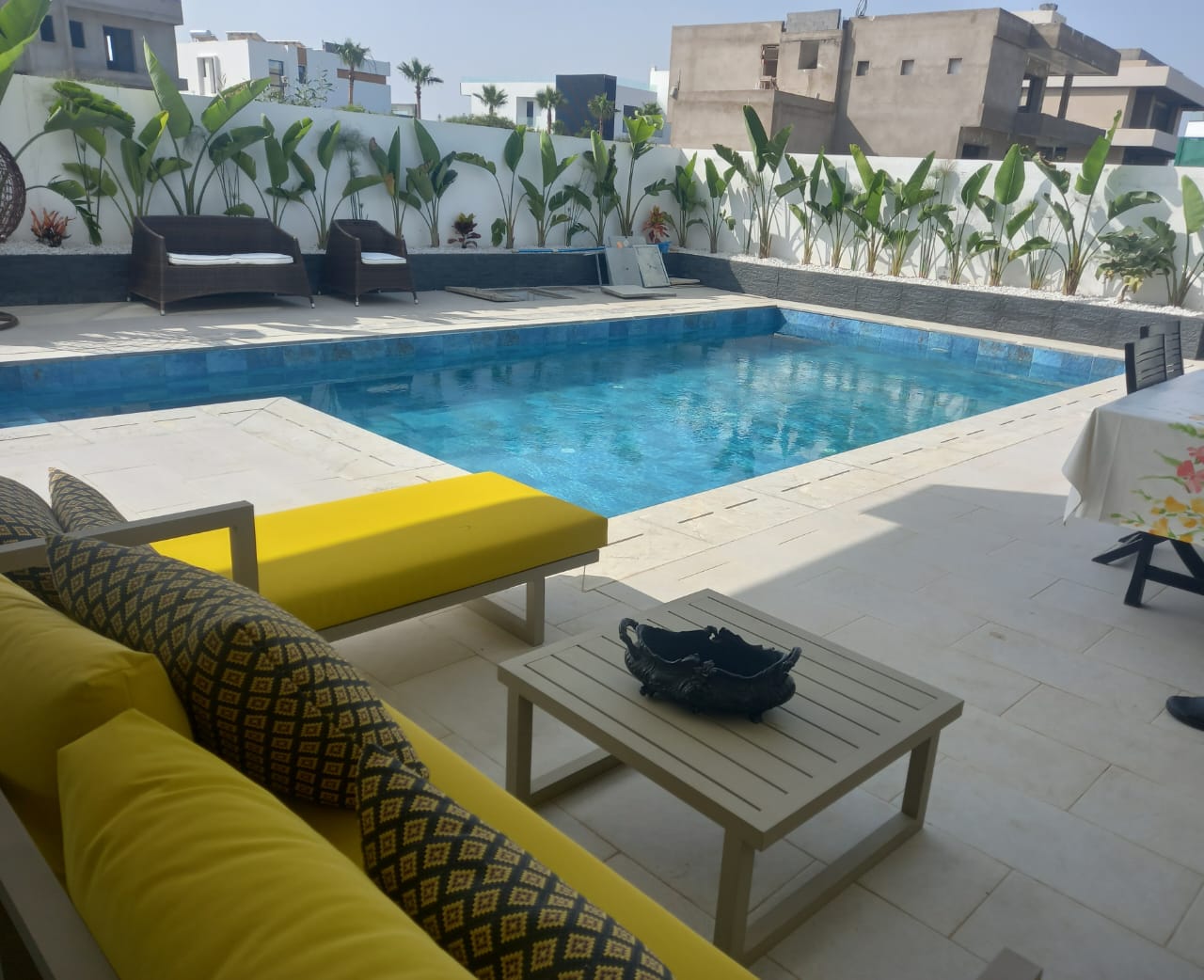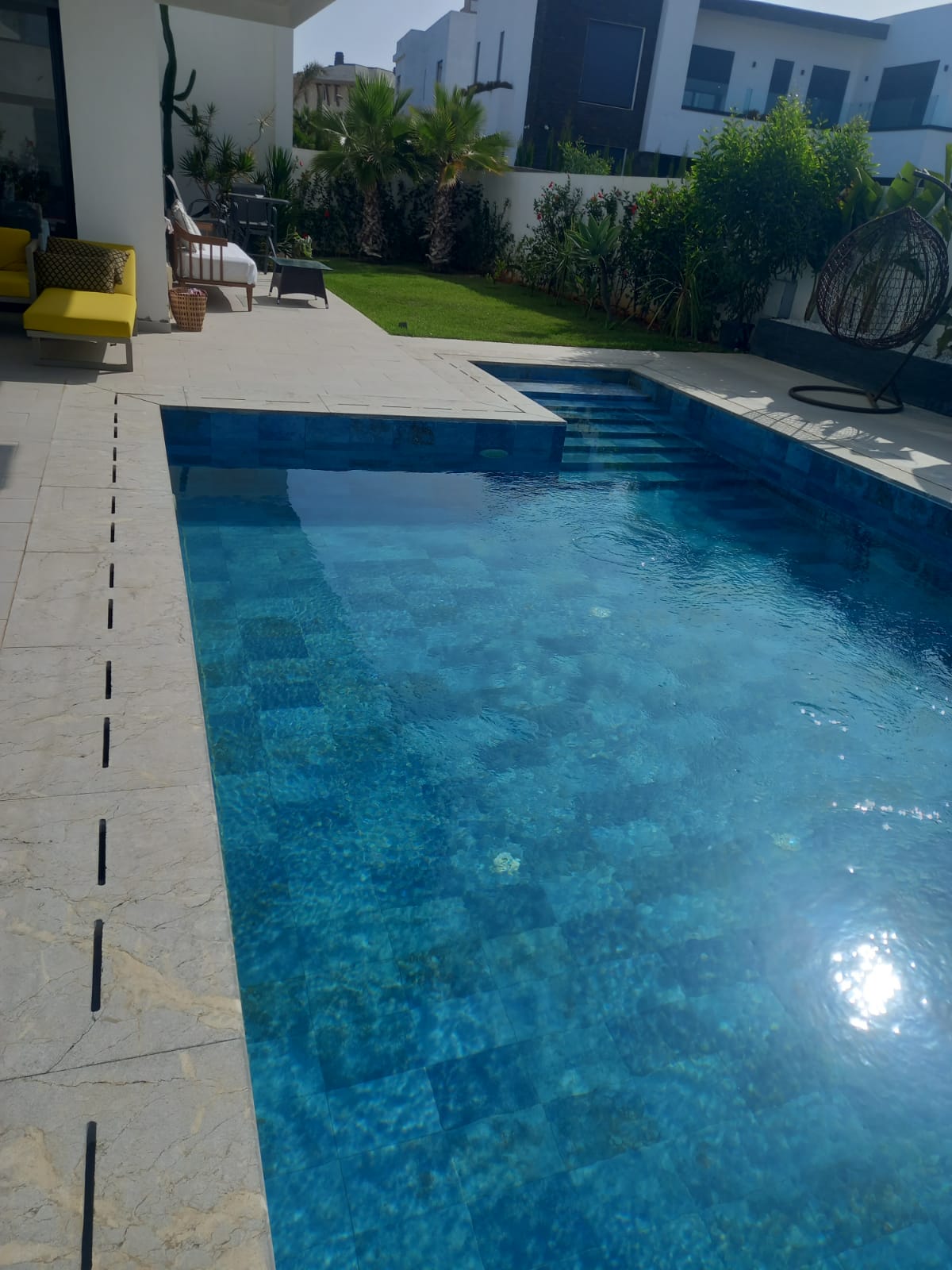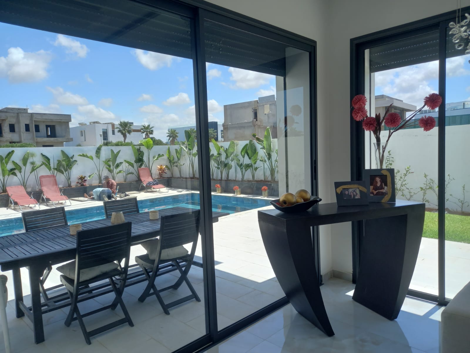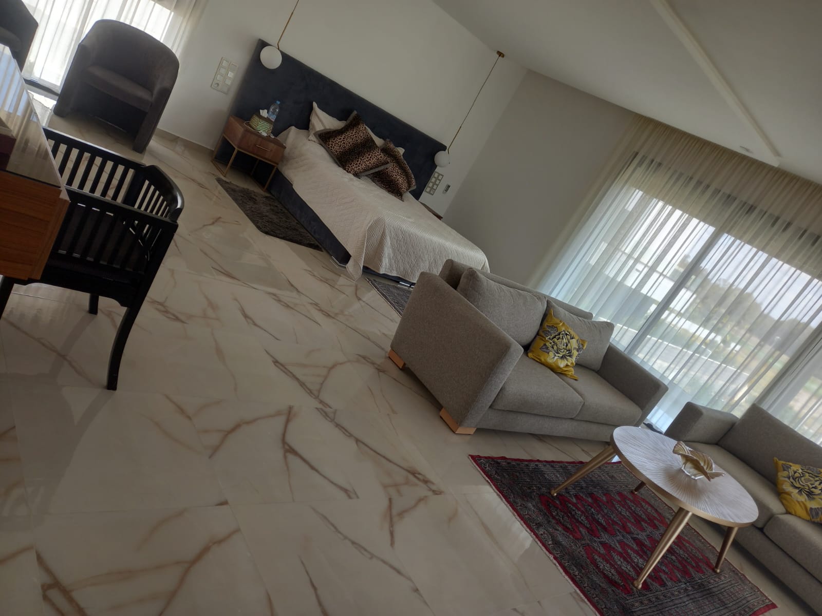 Bouznika golf Bahia Beach , une villa à vendre sur deux niveaux d’une superficie de 800 m² de terrain, et 600 m² construite se composant d’une réception ouverte, 4 salons , 4 chambres à coucher, 4 salles de bain, une cuisine équipée, une piscine, un jardin, ascenseur, une chambre de bonne et un garage pour 4 voitures